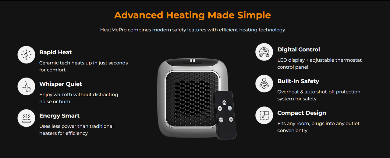 HeatMe Pro UK is a compact, plug-in-style portable heater designed to warm small-to-medium sized British rooms within minutes. It’s engineered with advanced ceramic heating technology and is marketed as an affordable alternative to central heating, radiators and space heaters.